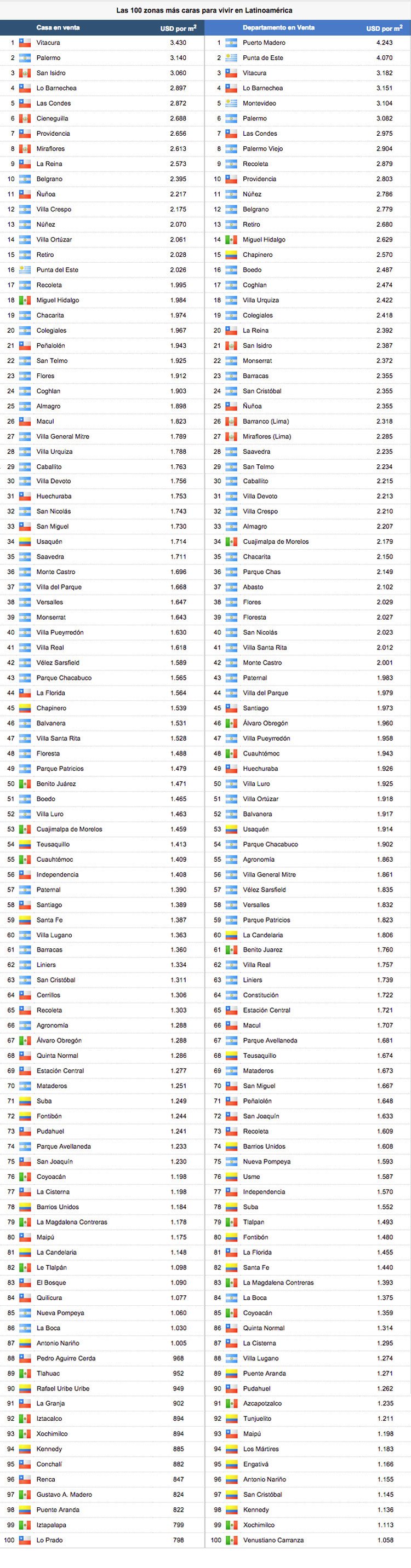 La lista los departamentos más caros está encabezada por el barrio argentino de Puerto Madero (4.243 dólares), seguido de la ciudad uruguaya de Punta de Este (4.070 dólares), el barrio chileno de Vitacura (3.182 dólares), el barrio chileno de Lo Barnechea (3.151) y la capital uruguaya, Montevideo, (3.104 dólares).