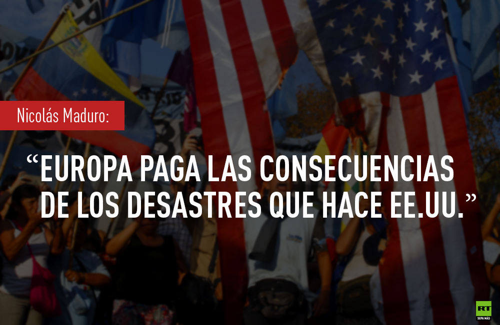 "El desastre en Irak lo causó EE.UU. en época de Bush con un falso propósito; con una mentira se metieron y destruyeron un país que es la cuna de la civilización. Ahora Irak está descuartizado en 20 pedazos", ha señalado Maduro. Lo mismo pasó en Libia y está pasando actualmente en Siria, donde Washington financia a los terroristas que destruyen el país, ha subrayado el líder venezolano. Todas estas intervenciones fueron planeadas para apropiarse del petróleo de estos países mediante transacciones ilegales en el mercado negro. Y las consecuencias de lo desastres que ha causado EE.UU. en Oriente Medio las está pagando Europa. Los países europeos no pueden afrontar la terrible crisis migratoria que actualmente están sufriendo.