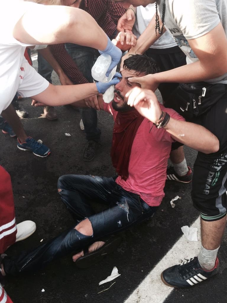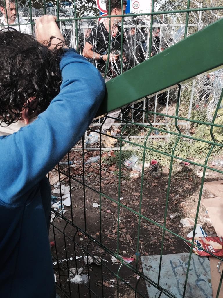 (foto Izq) Ahora afectado por el gas pimienta y (dcha) hace 5 horas desayunando. Indignacion en la frontera hungara pic.twitter.com/kU6OHhY88Y