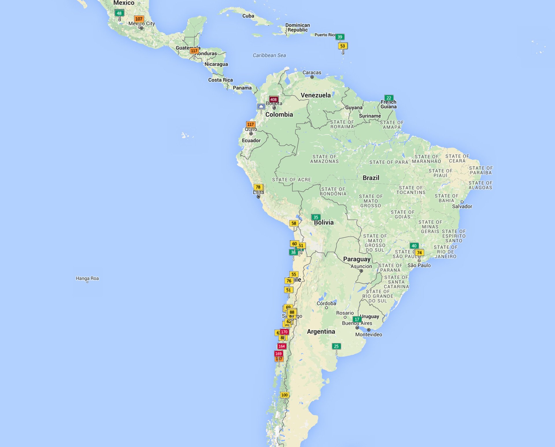 Las etiquetas verdes del mapa indican los niveles que no suponen ningún riesgo para la salud humana, mientras que las etiquetas de color rojo y malva significan que la contaminación del aire ha alcanzado niveles peligrosos para la salud de la población.