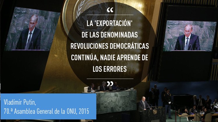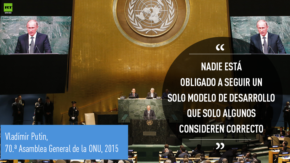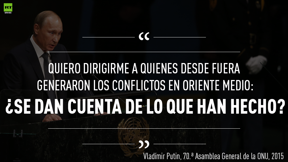 Durante su intervención en el marco del debate general de la Asamblea General de la ONU el presidente ruso condenó las acciones de los países que optaron por la vía violenta de la intervención en países como Siria, Irak y Libia, creando un caos político y un vacío que posteriormente ocuparon los terroristas.