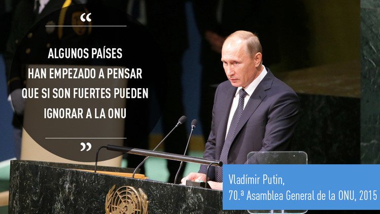 "Últimamente se pueden escuchar muchas críticas contra la ONU", empezó su intervención Vladímir Putin, comentando que a lo largo de la historia las decisiones de la ONU se han visto ensombrecidas por las dificultades y la ausencia de consenso, ante todo en el marco del Consejo de Seguridad de la ONU. "Pero las discrepancias han existido siempre, igual que siempre se ha aplicado el derecho a veto", insistió.