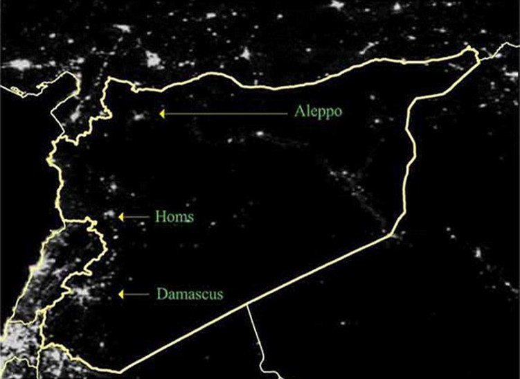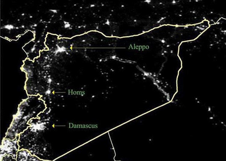 La intensidad eléctrica ha caído más de un 80 por ciento desde el inicio de la guerra, según el semanario británico. Este peculiar 'eclipse' fue más acentuado en la ciudad norteña de Alepo, "un campo de batalla feroz" entre los grupos rebeldes y las fuerzas gubernamentales donde la luz nocturna cayó un 97 por ciento, informa 'Time'.