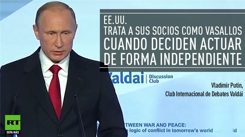 Junto a la guerra convencional conviven las guerras de sanciones, que también constituyen un grave problemas para distintos países del mundo, dijo Putin. En este sentido, la política de sanciones unilaterales de EE.UU. pretende tratar como "vasallos" a los socios de Washington que deciden actuar de forma independiente, comentó el mandatario ruso.