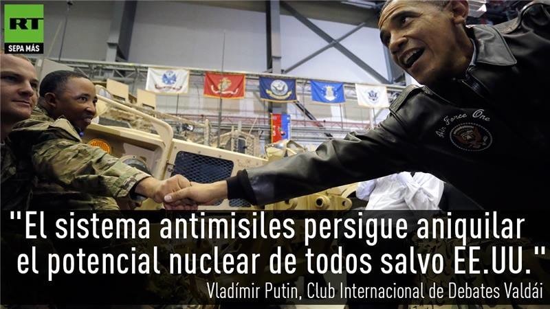 "EE.UU. se salió unilateralmente [del Tratado sobre Misiles Antibalísticos]. Hoy el programa nuclear iraní está resuelto […], no existe ni existió ninguna amenaza por parte de Irán. Así pues, la razón que EE.UU. antepuso para construir su sistema antimisiles ya no existe", expuso Putin, recalcando que el objetivo real es "aniquilar el potencial nuclear de todos países salvo el de EE.UU.".
