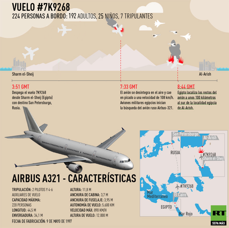 Varios medios estadounidenses informaron hoy que un satélite infrarrojo de ese país registró una explosión térmica en el momento de la catástrofe del avión ruso A321 de la aerolínea Metrojet (Kogalymavia) el 31 de octubre.