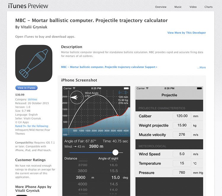 La app MBC-Computadora balística de morteros cuesta 30,99 dólares y está diseñada "para el cálculo balístico independiente", debido a que ofrece "datos de tiro rápidos y precisos para morteros de todos los calibres", según la descripción que ofrece la multinacional. De este modo, el usuario introduce datos como el ángulo del viento, la temperatura, la presión o el calibre y obtiene la información necesaria para realizar un disparo certero.