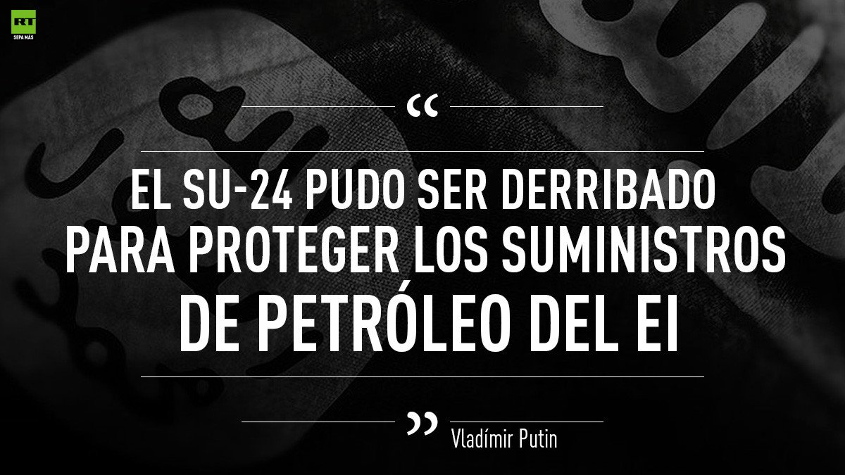 Rusia tiene motivos para pensar que el avión Su-24 fue derribado para asegurar el suministro de petróleo a Turquía por parte del Estado Islámico, ha expresado Putin. "Tenemos todas las razones para suponer que la decisión sobre el derribo de nuestro avión fue dictada por el deseo de garantizar la seguridad de estas vías de suministro de petróleo al territorio de Turquía, precisamente a los puertos donde es cargado en los petroleros", ha dicho Putin.