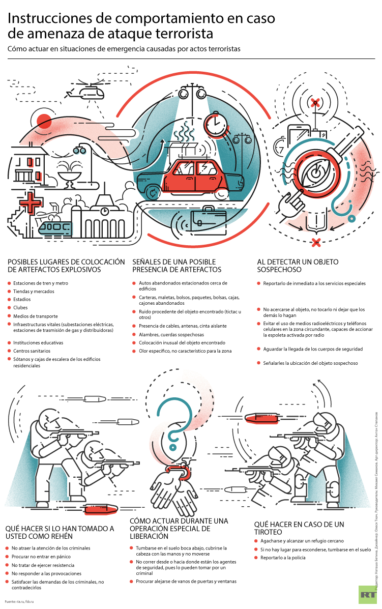 Por todo ello, una de las preguntas más actuales de nuestros días es cómo debemos actuar en caso de vernos atrapados en un ataque terrorista. Nuestra infografía les ofrece información acerca de los posibles lugares en que los fanáticos pueden colocar una bomba, cómo detectarla, así como reglas de actuación si le han tomado como rehén.