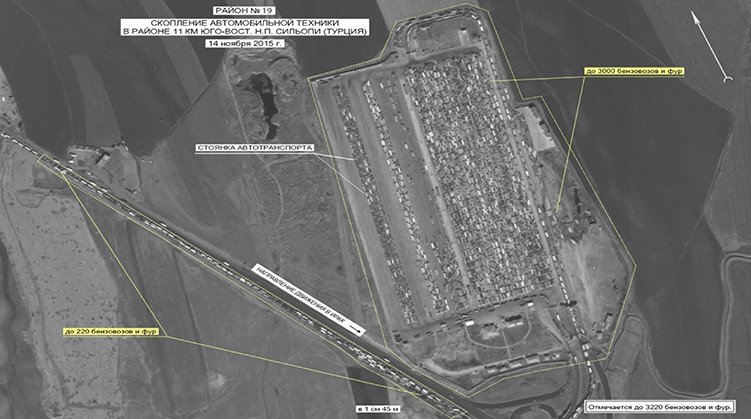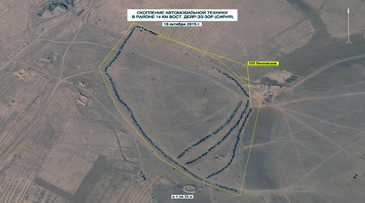 Durante una sesión informativa representantes del Ministerio de Defensa ruso han hecho públicas imágenes satelitales donde se ve cómo las colas de camiones cargados de petróleo robado por el EI se concentran en la frontera turco-siria.