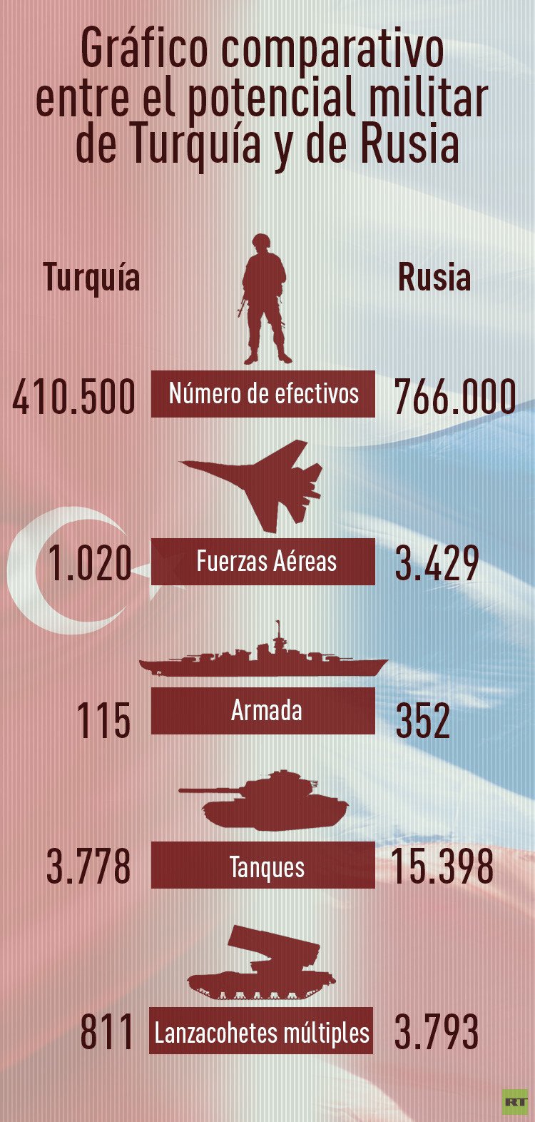 Asimismo, la cantidad de unidades de la Fuerza Aérea y de la Armada de Rusia supera la de Turquía tres veces.