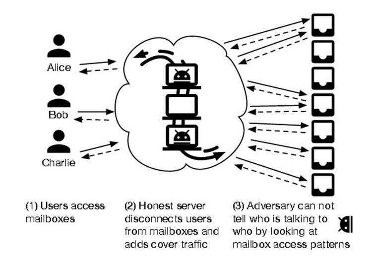Un usuario hipotético envía un mensaje a través de Vuvuzela. El mensaje empieza su ruta por varios servidores interconectados que envían ruido a otros usuarios. Al encontrar un mensaje en su buzón, el destinatario recorre otra vez la misma ruta, generando de nuevo tráfico basura, hasta que llega a su mensaje. Todo este tráfico carente de información obstaculiza la misión de seguir las conexiones de usuarios.
