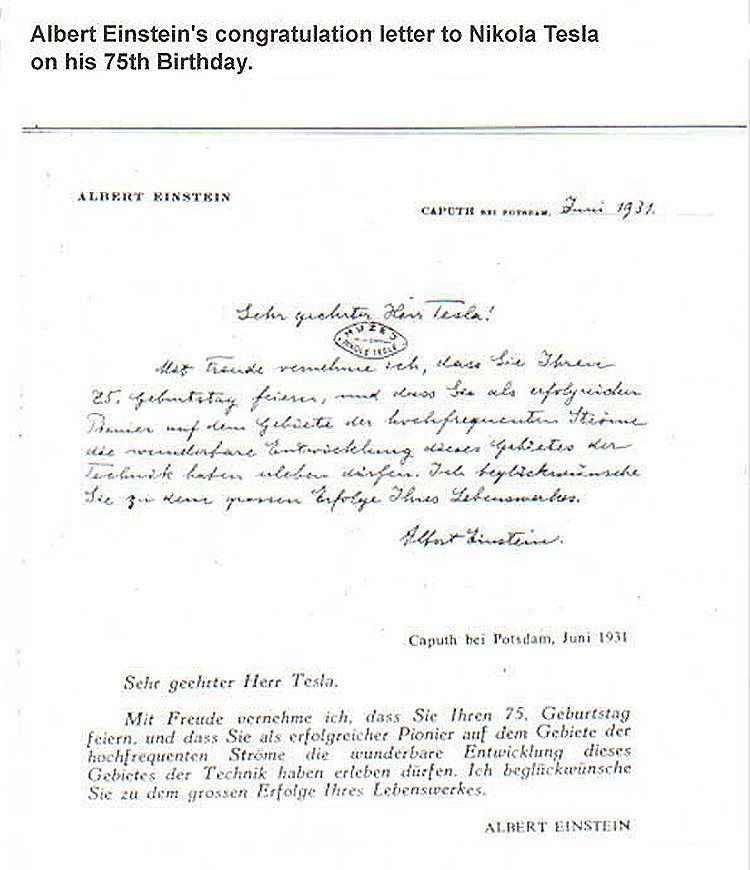 Sin embargo, y pese a que no se conocían, Einstein le mandó una carta a Tesla en 1931 con motivo de su 75.º cumpleaños. "Estimado Sr. Tesla, me complace saber que está usted celebrando su 75 aniversario como pionero de éxitos en el campo de las corrientes de alta frecuencia y que esta área de la tecnología ha conseguido un maravilloso desarrollo. Le felicito por el gran éxito de su trabajo", rezaba la misiva.