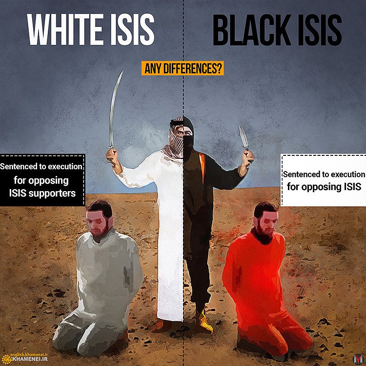 La imagen muestra a dos ejecutores, uno de Arabia Saudita bajo el nombre "EI blanco", y otro del Estado Islámico ("EI negro") junto a sus respectivas víctimas. Junto a la víctima de Riad se puede leer: "Condenado a ser ejecutado por oponerse a los patrocinadores del EI", mientras que al lado de la víctima de los yihadistas pone: "Condenado a ejecución por oponerse al EI". El montaje se presenta bajo la pregunta: "¿Existe alguna diferencia?".