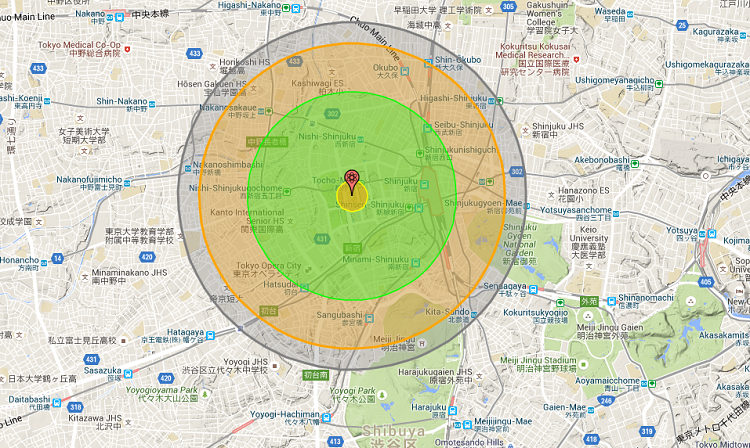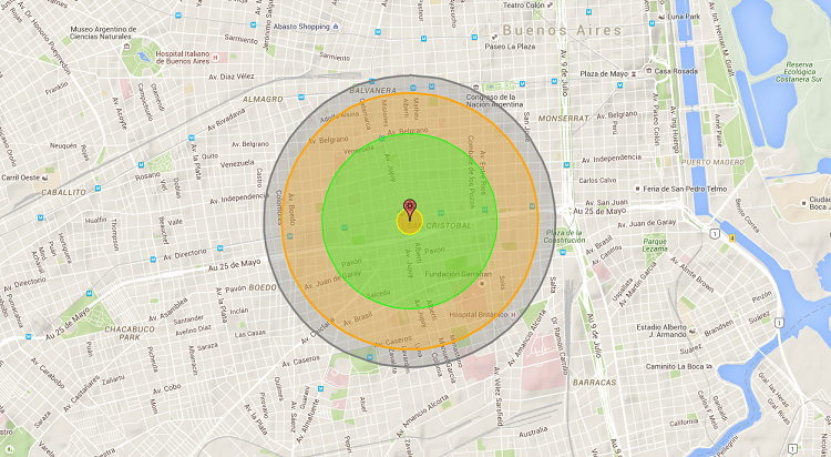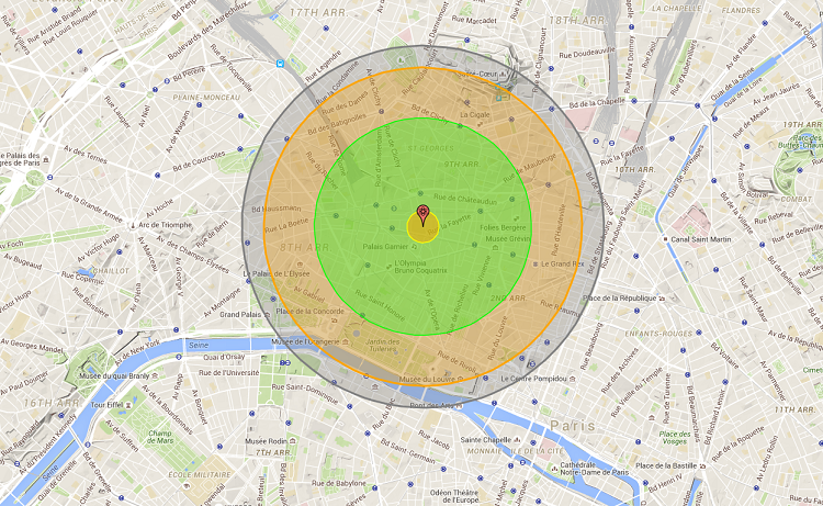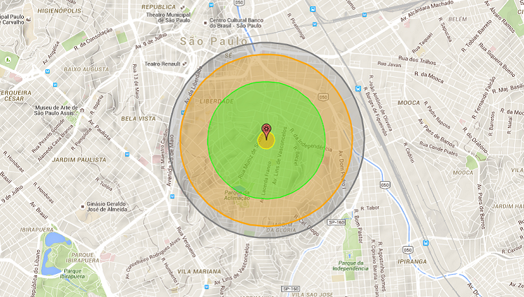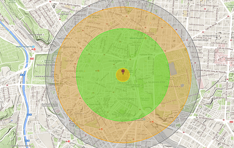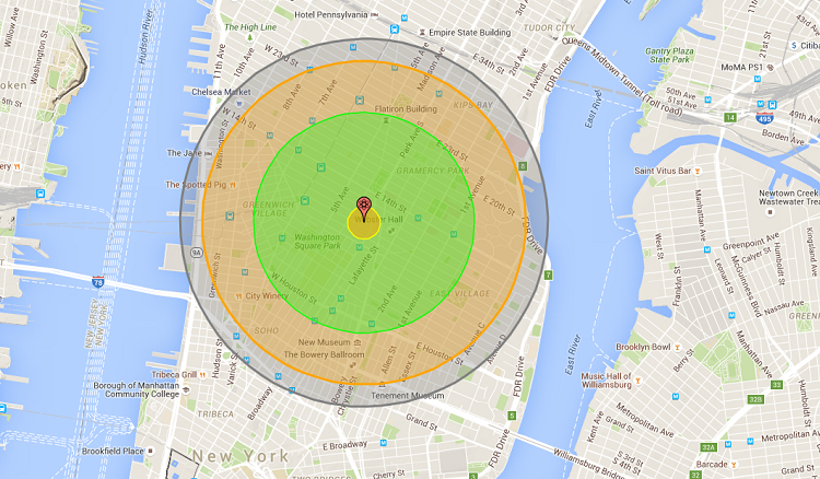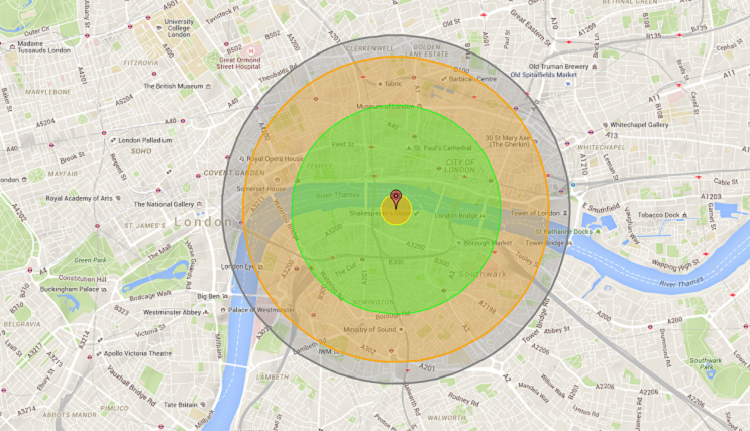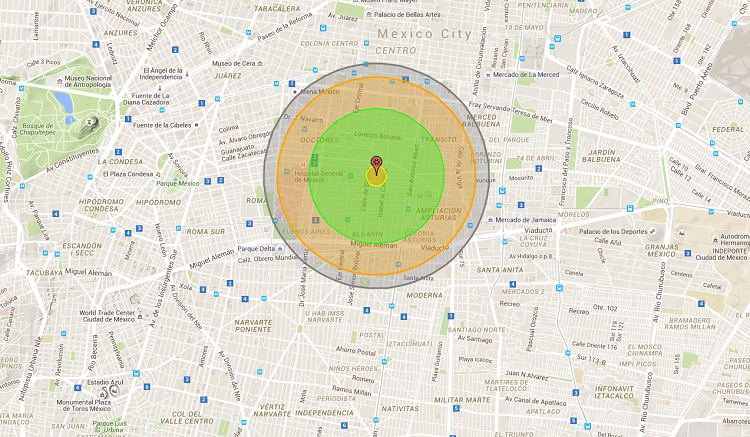 Cada mapa muestra una serie de zonas de radio de acción de la bomba diferenciadas por círculos de colores, donde el amarillo representa la bola de fuego provocada por la explosión, seguido por el área de la onda expansiva representada por el color rojo, la más potente, y el gris, una ráfaga menos potente pero igual de mortal.