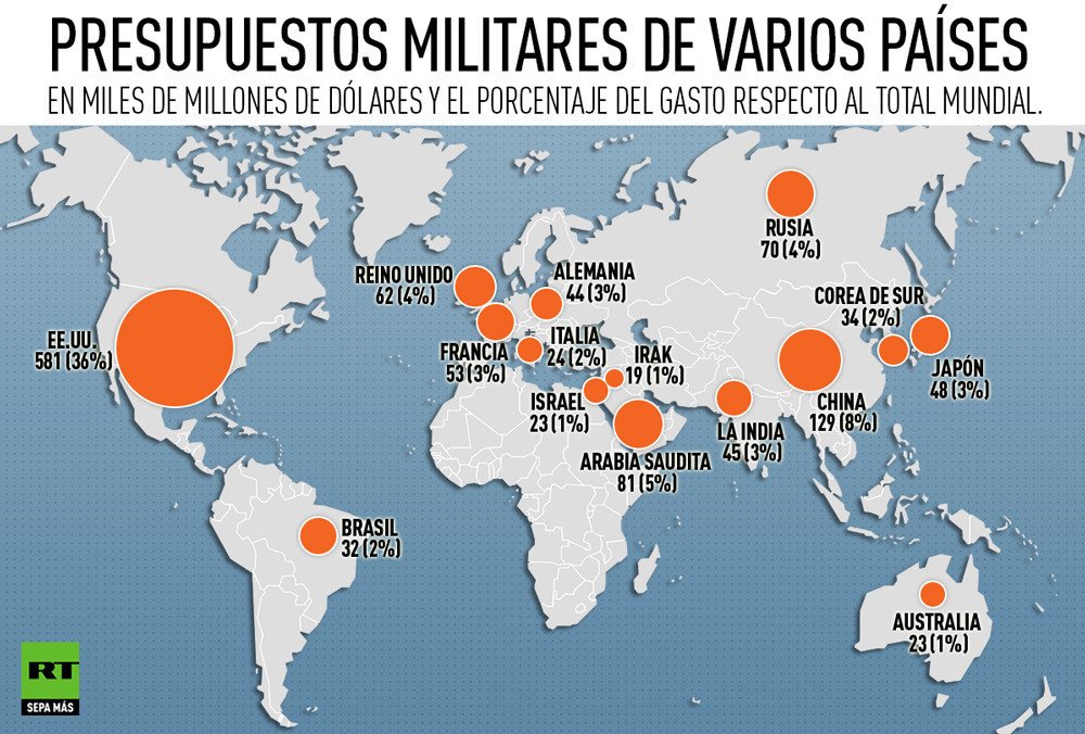 Mientras tanto, los gastos militares de EE.UU. superan en mucho a todos los demás países, siendo casi cinco veces mayores que los de China, el segundo país del mundo con mayor presupuesto militar.