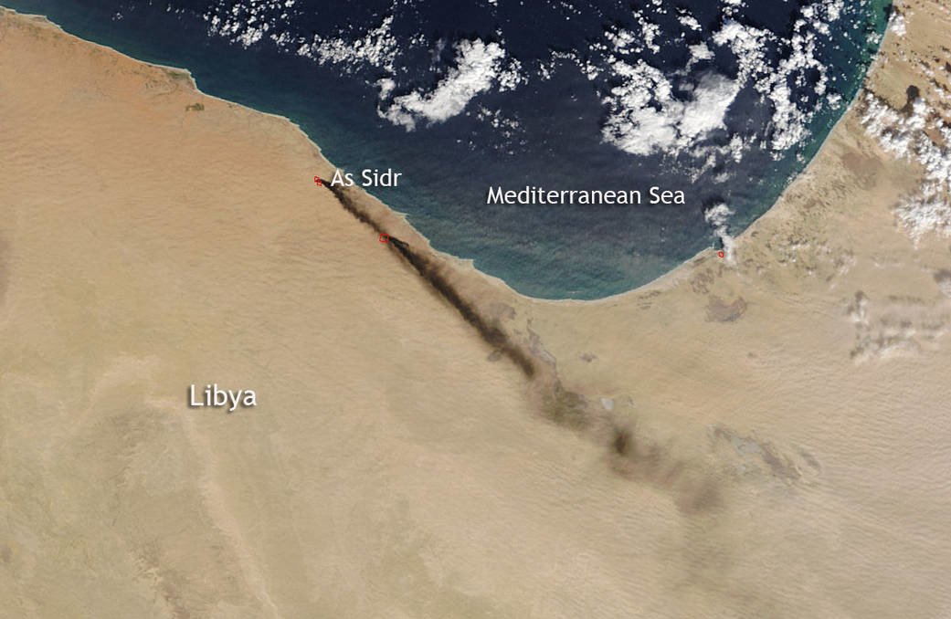Las fotos que muestran cómo se ha propagado el humo desde el 7 de enero fueron tomadas por el espectrorradiómetro MODIS (Moderate Resolution Imaging Spectroradiometer) desde el satélite Terra de la NASA. Los incendios se han extendido por la costa mediterránea cerca de las instalaciones de Sidra, entre Sirte y Bengasi.