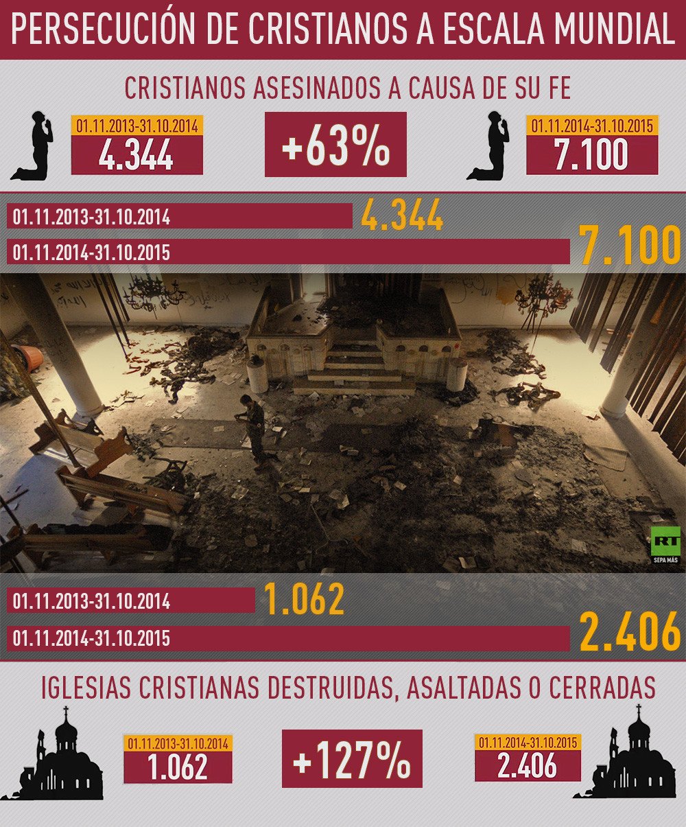 El año 2015 fue el más violento de la historia moderna para la comunidad cristiana al alcanzarse "un nivel similar a la limpieza étnica", reporta el informe anual elaborado por la ONG Puertas Abiertas. Según la Lista Mundial de la Persecución de 2016, 7.100 cristianos fueron asesinados por practicar su fe en un año –del 1 de noviembre de 2014 al 31 de octubre de 2015–, una cifra superior en 3.000 personas al período anterior, lo que supone un incremento de más del 60% en el número de muertos.