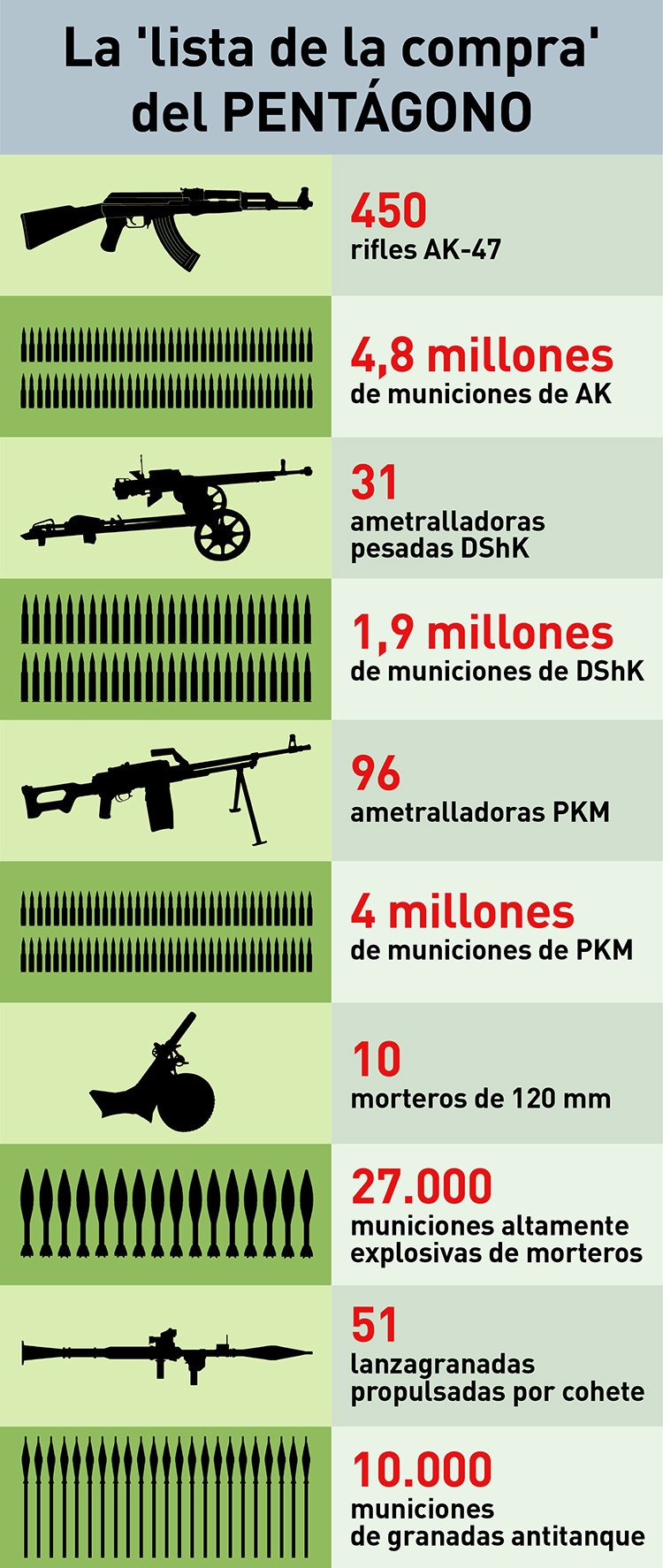 Entre las armas que el Pentágono quiere adquirir hay cientos de rifles AK-47, morteros y ametralladoras pesados, lanzagranadas propulsadas por cohete y millones de municiones, suficientes para equipar a todo un batallón. Por el momento, el Pentágono no ha precisado quién se quedará exactamente las armas.