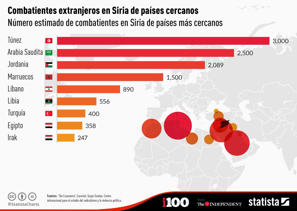 Según los datos proporcionados por diferentes centros de investigación e institutos citados en una publicación del diario 'The Independent', entre los que destaca el Centro para el Estudio del Radicalismo y la Violencia Política, la mayoría de los combatientes de países geográficamente más alejados del territorio sirio que participan en la lucha contra el Estado Islámico provienen de Francia y el Reino Unido, mientras que Túnez y Arabia Saudita encabezan la lista de países cercanos a Siria que más uniformados han enviado.