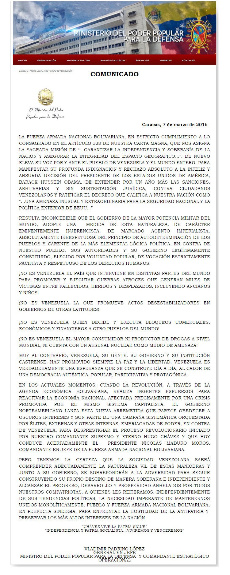 "No es Venezuela el país que interviene en distintas partes del mundo para promover y ejecutar guerras atroces que generan miles de víctimas entre fallecidos, heridos y desplazados", reza el comunicado del Ministerio venezolano de Defensa que rechaza la decisión de EE.UU. de prolongar un año más las sanciones antivenezolanas.