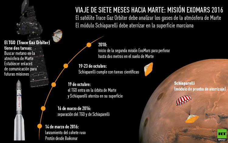 A las 09.31 GMT de este lunes se ha lanzado desde el cosmódromo de Baikonur el cohete ruso Protón con el satélite Trace Gas Orbiter (TGO) y la sonda espacial Schiaparelli a bordo. Esta misión representa la primera etapa del programa ExoMars, realizada por la Agencia Espacial Europea (ESA) junto con la Agencia Espacial Federal Rusa (Roscosmos).