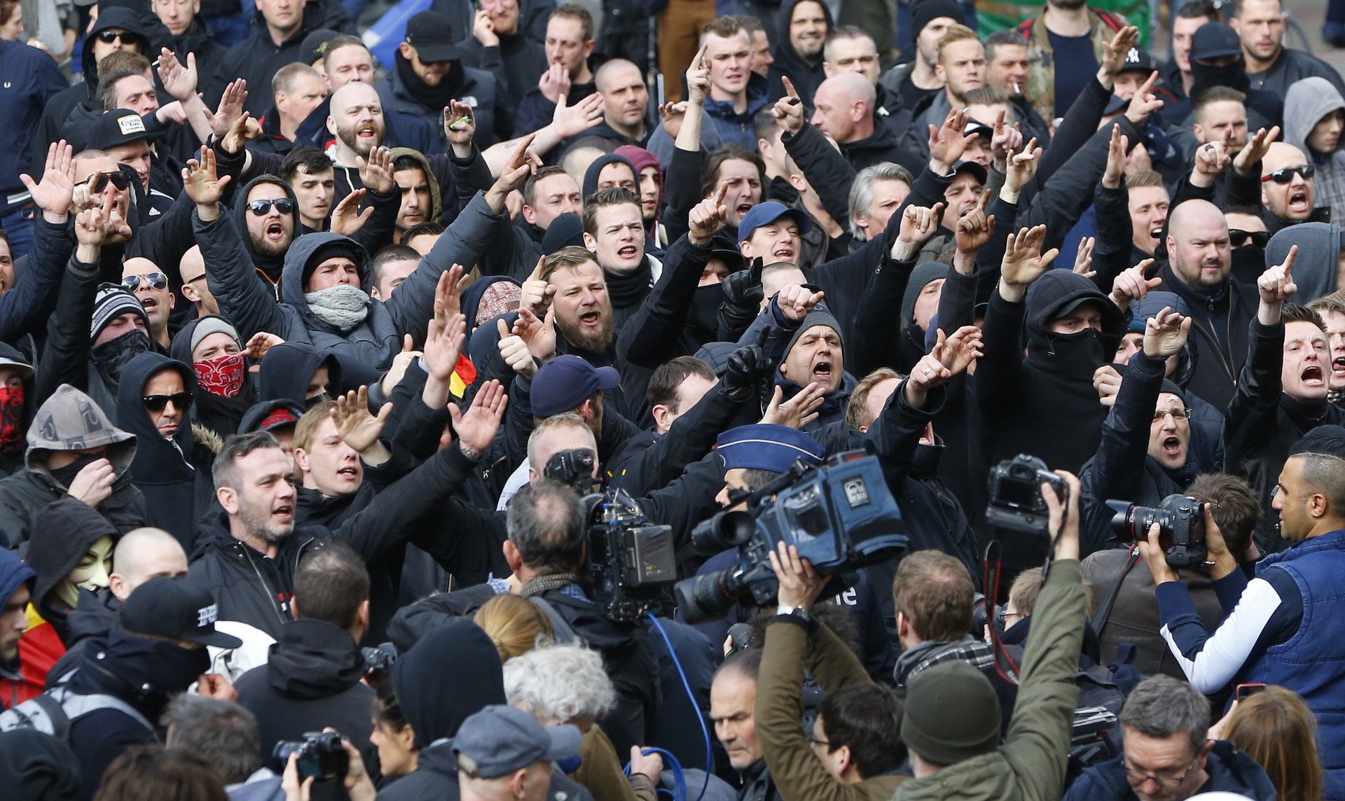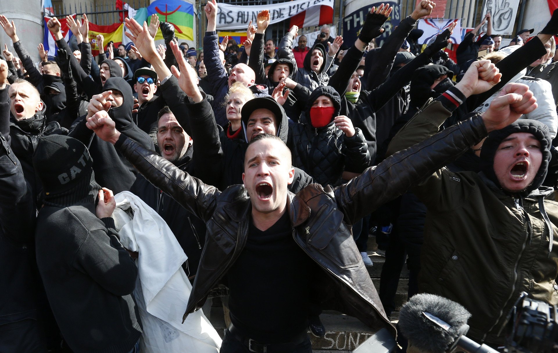 Cientos de personas vestidas de negro se han congregado frente al edificio de la Bolsa de Bruselas, donde la gente deposita flores y velas en homenaje a las víctimas de los atentados del 22 de marzo, gritando "Todos contra el Estado Islámico". Los neonazis están bajo la vigilancia de decenas de policías.