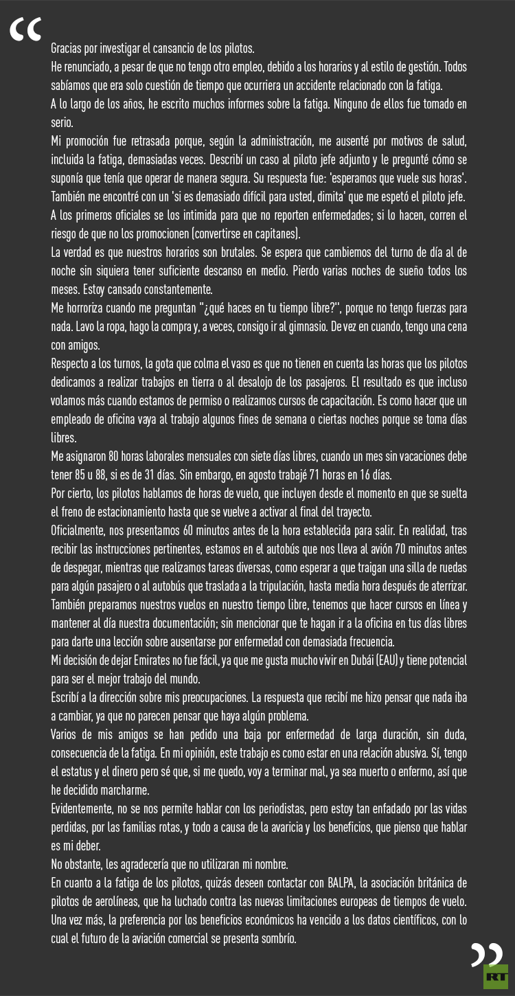 De esta forma, un expiloto de la aerolínea Emirates bajo condición de anonimato ha proporcionado a RT detalles de algunos de los procedimientos "ilegales" de la empresa. A continuación puede ver una parte de su carta a RT: