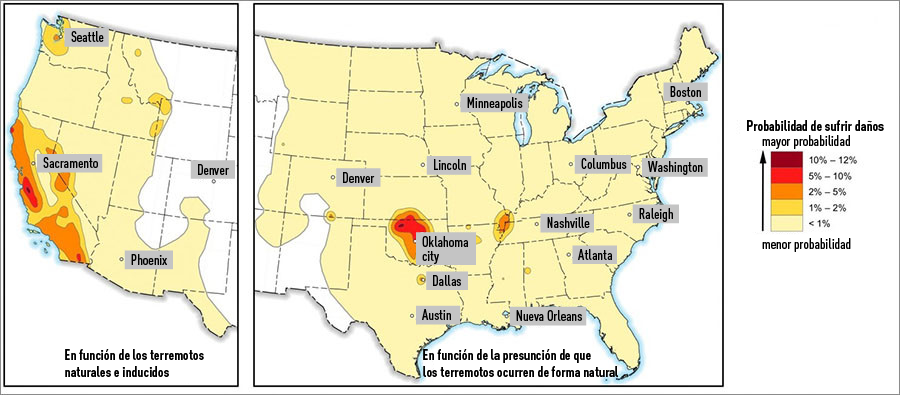 Unos 7 millones de personas viven en zonas de riesgo de terremotos artificiales, concluye el estudio. Los mapas anteriores no tenían en cuenta los temblores provocados por la actividad humana, pero el último informe presume que en el futuro ocurrirán más temblores de esta índole.