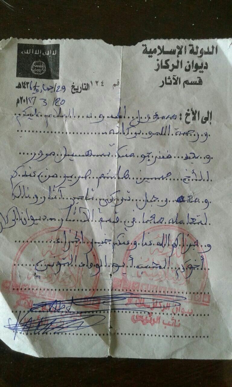 Uno de los nuevos documentos es esta nota, probablemente perteneciente a algún ministerio del Estado Islámico que controla el flujo de los objetos que obtienen los yihadistas.