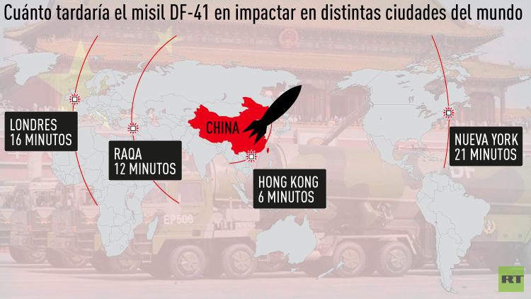 Un alcance estimado de 14.500 kilómetros tiene el misil nuclear DF-41 presentado por China que, además, puede transportar múltiples ojivas y es capaz de impactar en cualquier parte del territorio estadounidense.