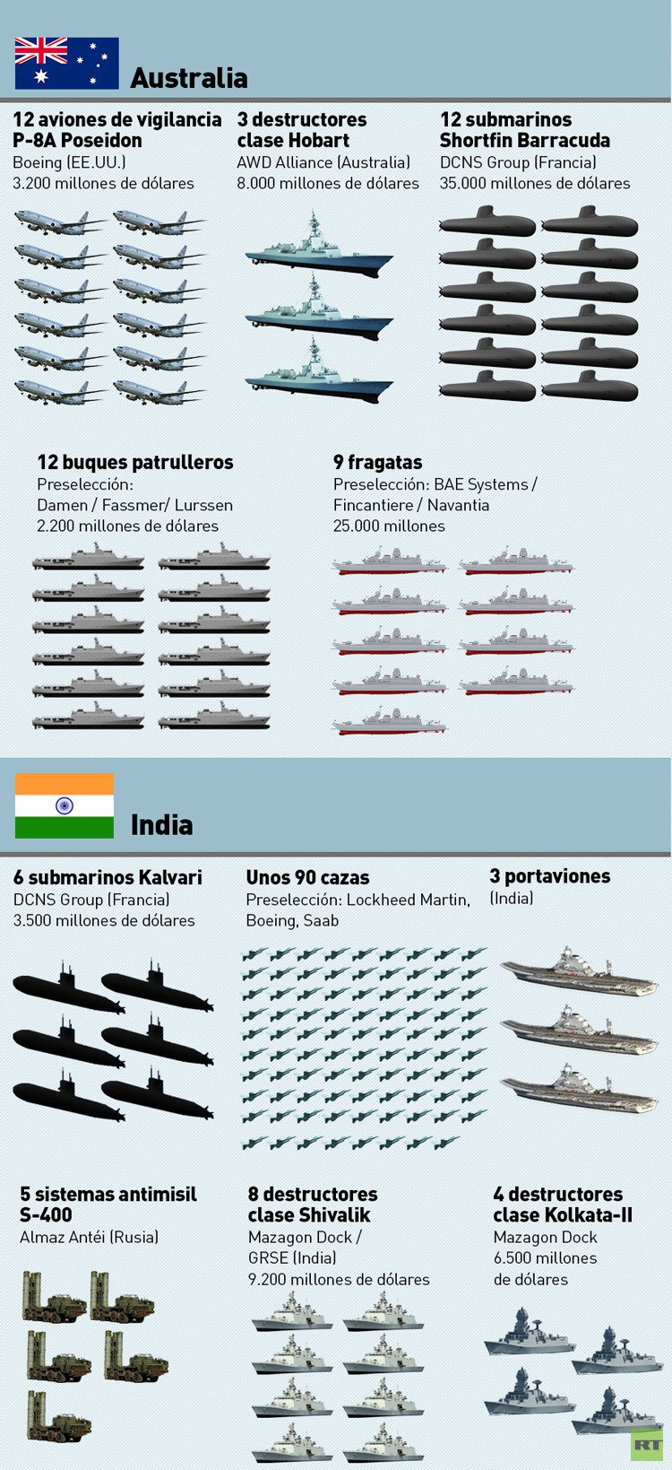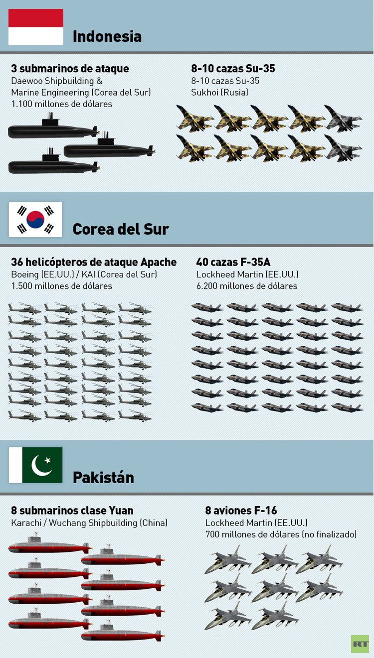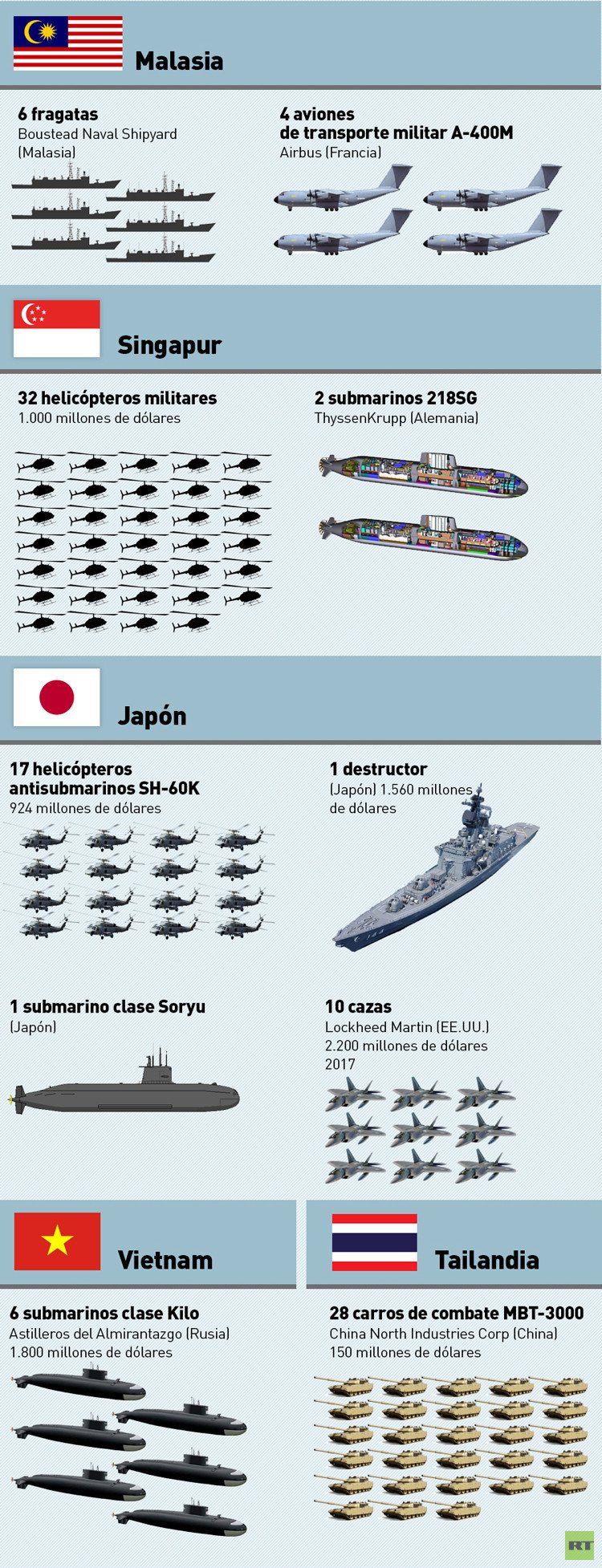 "Todo lo nuevo y chulo que produce EE.UU. va al Pacífico", señala el almirante estadounidense Harry B. Harris Jr., escribe Bloomberg. Este reforzamiento de los contingentes militares es motivo de preocupación en analistas y expertos, que advierten de una posible carrera armamentista en la región. Esta es la 'lista de la compra' del material bélico que ansían tener los países de la región de Asia-Pacífico.