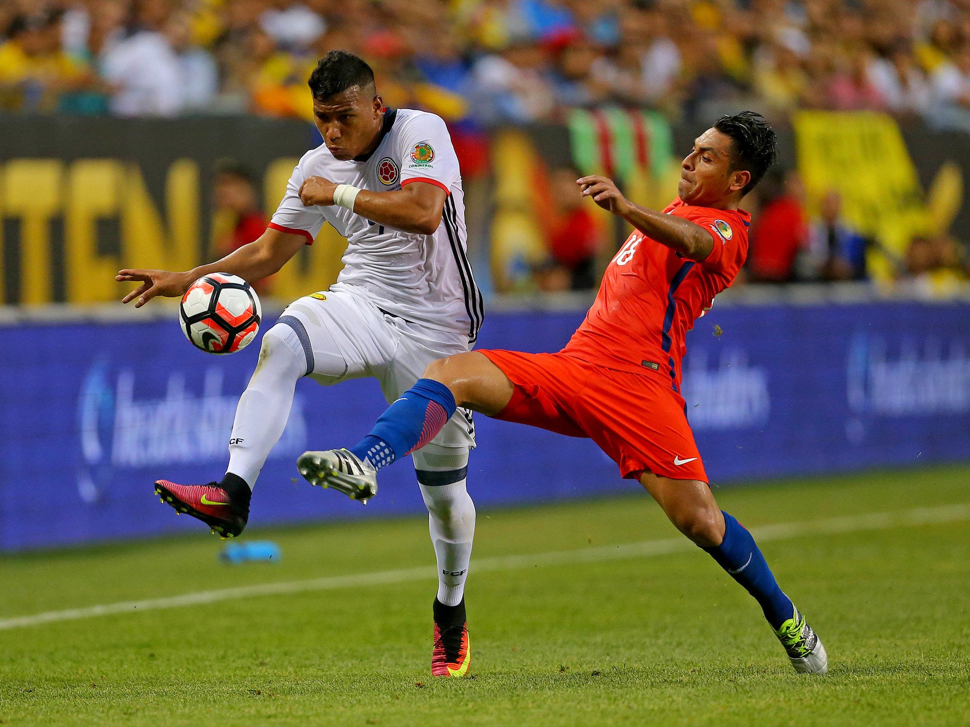 09' | Santiago Arias evita el segundo gol para Chile. Cuadrado intenta un remate a la portería chilena