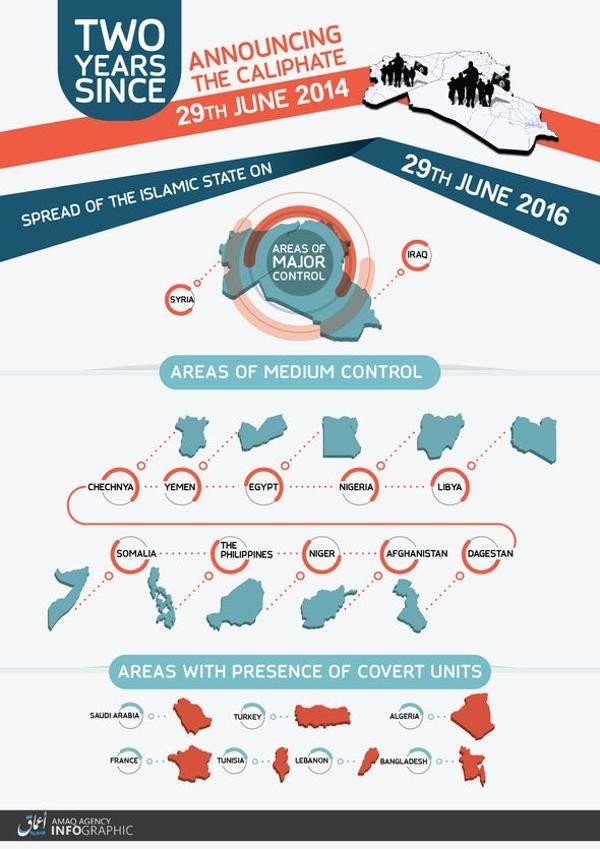 Bajo el pretexto de cumplirse dos años desde que el Estado Islámico declaró su califato en Siria e Irak ―el 29 de junio de 2914― el grupo terrorista ha difundido un mapa que pone de relieve su aterrador alcance en el mundo.