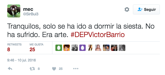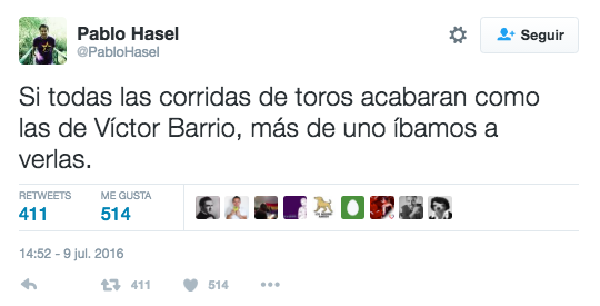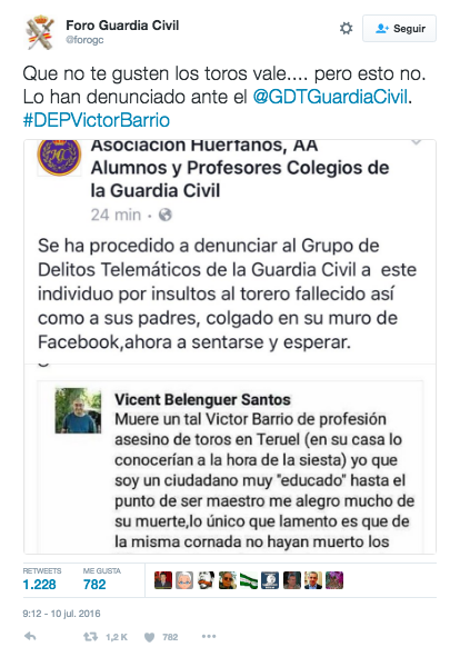 El torero español Víctor Barrio, de 29 años, falleció el pasado sábado tras sufrir una cornada durante una corrida en la plaza de toros de Teruel. La red social Twitter reaccionó a la noticia no sólo con mensajes de condolencias, sino también de expresiones de alegría. Algunos antitaurinos celebraron la muerte del diestro con mensajes como los siguientes: