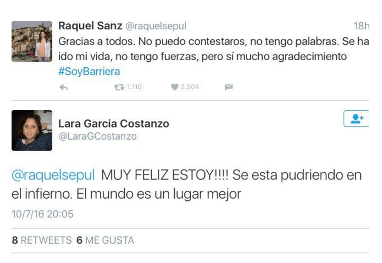 "Muy feliz estoy. Se está pudriendo en el infierno. El mundo es un lugar mejor". Así contesta una tuitera al mensaje de gratitud de la viuda del torero por el apoyo recibido tras el fallecimiento de su marido.