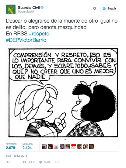 La Guardia Civil se vio obligada a intervenir con un mensaje en el que aseguraba que "Desear o alegrarse de la muerte de otro igual no es delito, pero denota mezquindad":