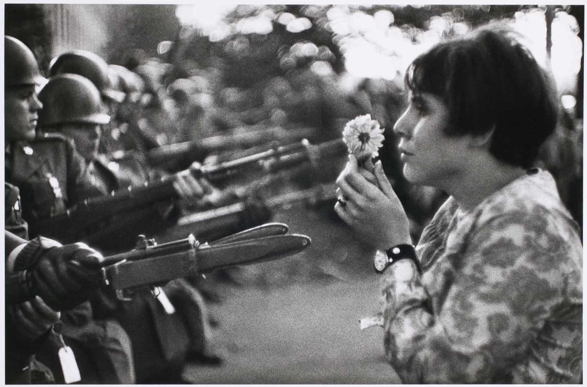 Otra fotografía que dio la vuelta al mundo es 'La jeune fille a la fleur' ('la chica de la flor'), tomada por el reportero Marc Riboud durante una manifestación contra la Guerra de Vietnam frente al Pentágono en 1967.