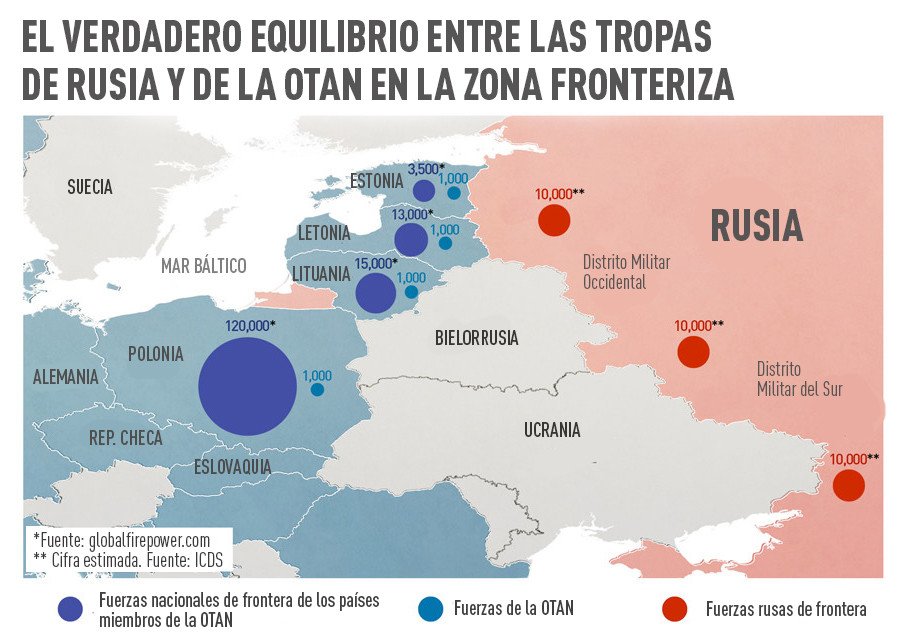 Por su parte, la OTAN quiere enviar 4.000 soldados, en su mayoría estadounidenses y británicos, a los Estados bálticos y Polonia. Esta gráfica está siendo utilizada como una herramienta de propaganda para hacer creer que 4.000 efectivos 'de defensa' de la OTAN se enfrentarán a 30.000 rusos 'agresivos'.