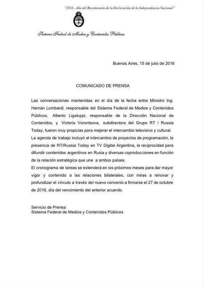 El titular del Sistema Federal de Medios y Contenidos Públicos de Argentina, Hernán Lombardi, el responsable de la Dirección Nacional de Contenido, Alberto Ligaluppi, y la subdirectora del Grupo RT, directora de Emisión de RT en Español, Victoria Vorontsova han mantenido conversaciones el 15 de julio respecto a la presencia del canal de televisión RT en la Televisión Digital Argentina (TDA).