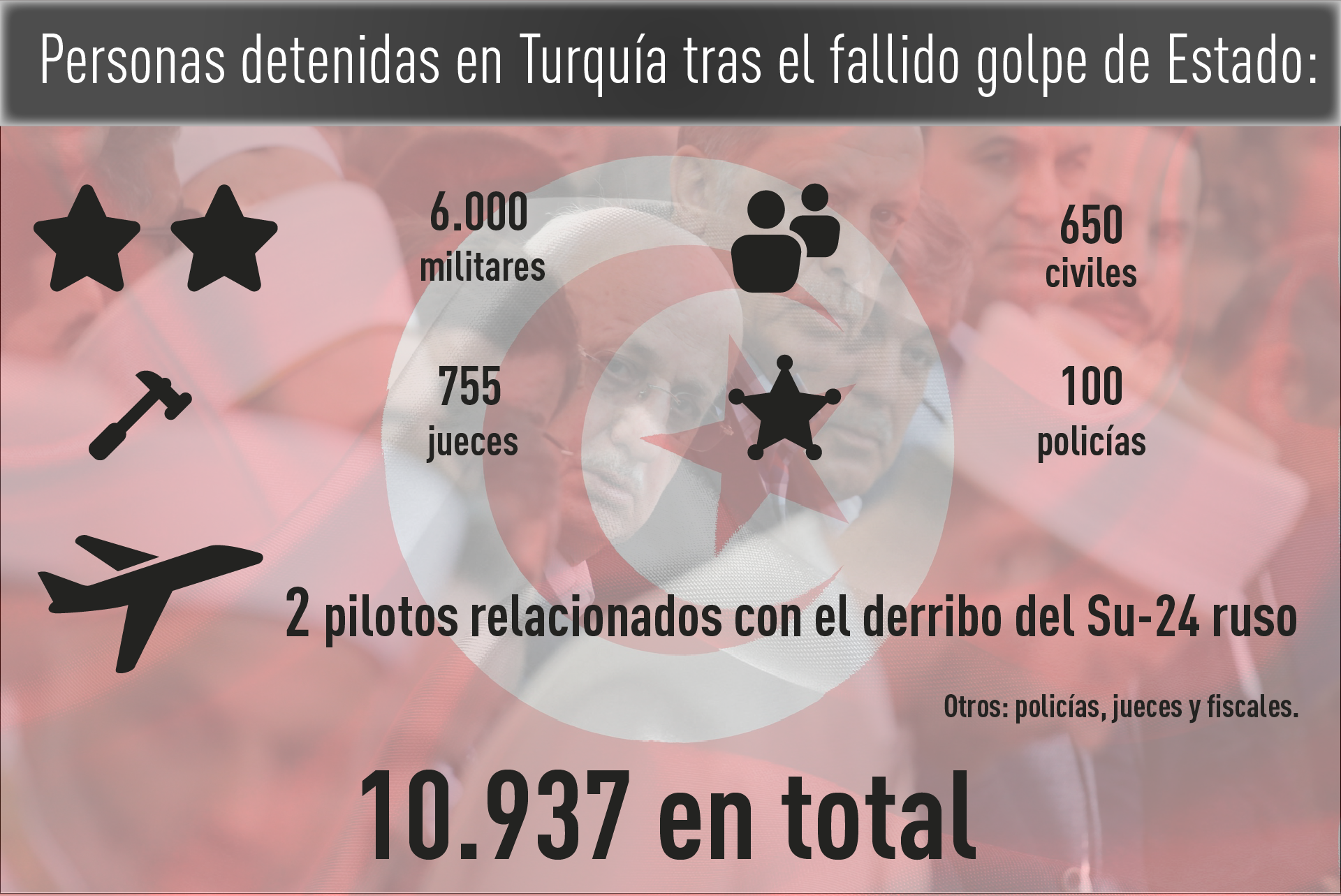 El presidente Erdogán aseguró este miércoles que un total de 10.937 personas han sido arrestadas en Turquía desde la sublevación militar del pasado viernes. El mandatario turco confirmó estas detenciones en una entrevista con la televisión árabe Al Jazeera, en la que analizó el fallido intento de golpe, tras el cual han sido arrestados más de 6.000 militares y un centenar de policías, además de numerosos jueces y fiscales.