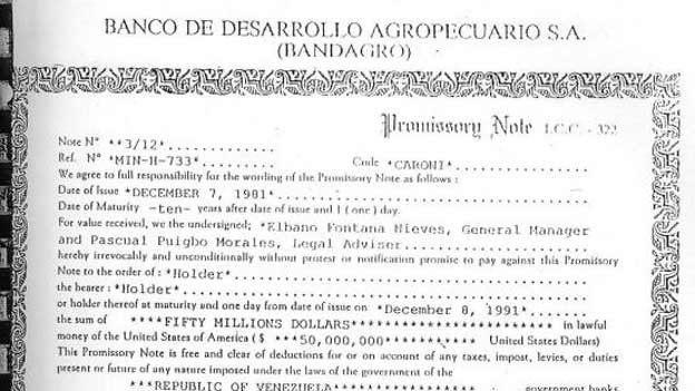Una de las empresas que obtuvo esos bonos, supuestamente emitidos por Bandagro, fue la firma norteamericana Skye Ventures. En 2004, la compañía demandó a Venezuela para exigir el pago de 100 millones de dólares más intereses ante un tribunal de Ohio.