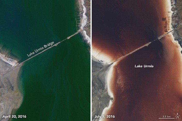 Entre los meses de abril y julio de este año, el agua salada del lago Urmía, ubicado en el oeste de Irán, próximo a las fronteras con Turquía e Irak, ha pasado de presentar una tonalidad verde oscuro al rojo sangre, un hecho contrastado por las imágenes captadas por el satélite de observación Aqua de la NASA.