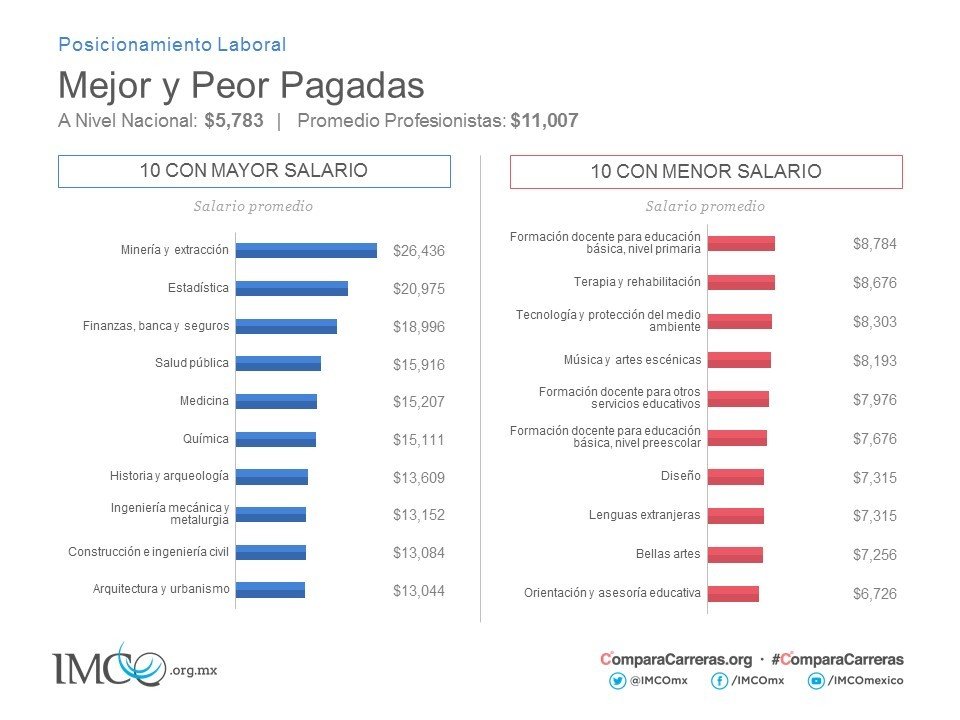 El análisis comparativo explica que en México hay 3,7 millones de estudiantes universitarios y 10 millones de profesionales licenciados, los cuales han optado por invertir en una carrera que les proporciona o proporcionará un puesto bien remunerado en comparación con aquellos que no tienen estudios superiores. Sin embargo, el IMCO plantea a los futuros estudiantes las distintas posibilidades y diferencias existentes entre las distintas carreras en base a su salario promedio, su posicionamiento laboral y el costo de la carrera.