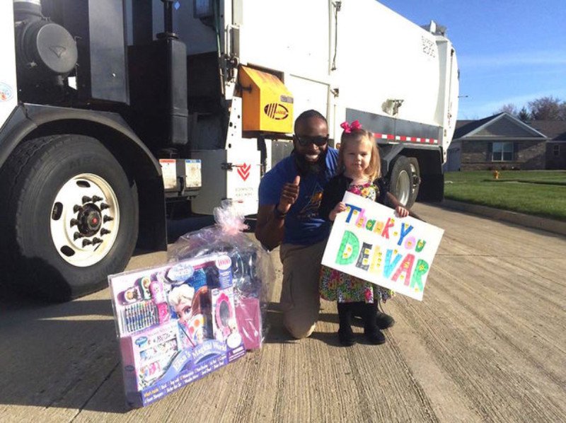 Brooklyn, de tres años, vecina de la ciudad estadounidense de Bloomington, en Illinois, saluda desde su ventana a Delvar Dopson, que recoge la basura cada jueves en el barrio donde vive la niña.