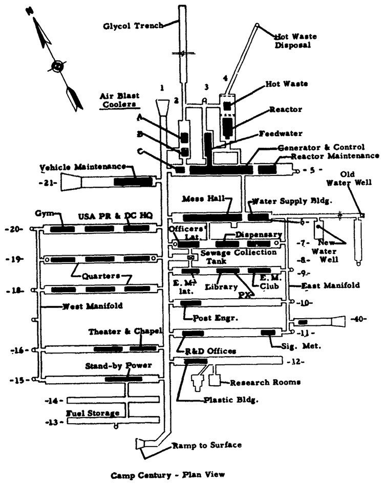 La base Camp Century constaba de 21 túneles bajo el hielo, con una longitud total de tres kilómetros. Además del primer reactor nuclear móvil del mundo, Alco PM-2A, el lugar albergaba entre 85 y 200 soldados y científicos. Esas personas desplegadas disponían de laboratorios, una biblioteca, una cafetería, un hospital, una iglesia, un pequeño teatro y otras comodidades fuera de lo común, teniendo en cuenta la ubicación.
