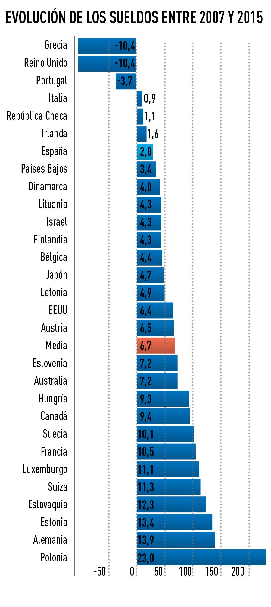 Entre los años 2007 y 2015, solo tres países han sufrido una descenso salarial. Se trata de Reino Unido y Grecia, ambos con un 10,4%, y Portugal, con una bajada salarial del 3,7%. En el resto de países los sueldos han crecido, pero lo han hecho de forma muy diferente. Polonia y Alemania se sitúan a la cabeza con unos sueldos que han subido un 23% y un 13,9%, respectivamente. Sin embargo, los italianos (0,9%), los checos (1,1%), los irlandeses (1,6%) y los españoles (2,8%), apenas han notado un incremento salarial en los últimos 9 años.