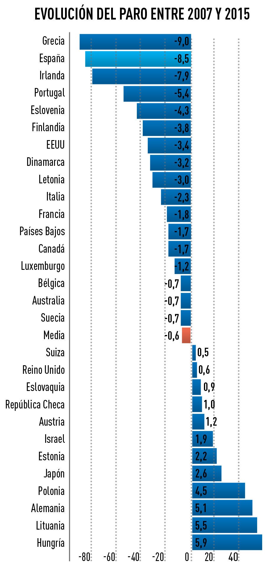 La federación de sindicatos británica también ha estudiado la tasa de paro durante los últimos años. Aquí, también se registran desigualdades importantes. Grecia y España son los países de la OCDE que más empleo han destruido entre 2007 y el 2015, con un aumento del desempleo del 9,0 y el 8,5%, respectivamente. Frente a ellos, países como Hungría, Lituania y Alemania, donde el empleo ha aumentado por encima del 5%.