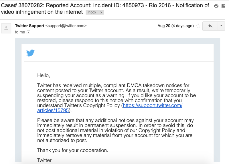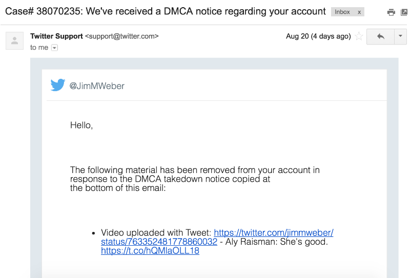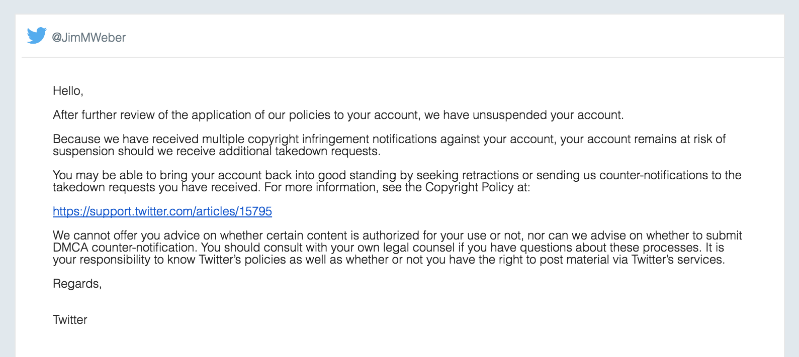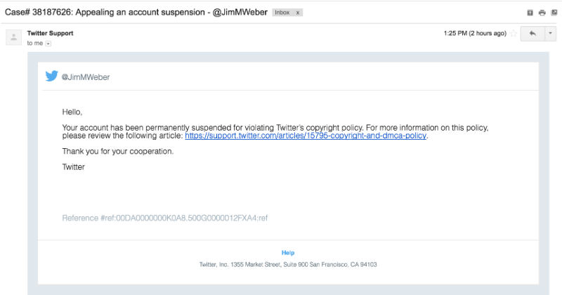 Tan solo tres minutos después, Weber recibió otro correo por parte de Twitter, que le avisaba sobre la suspensión de su cuenta por violar de la Ley de Derechos de Autor de la Era Digital (DMCA, por sus siglas en inglés) y al que el usuario respondió una decena de veces preguntando cuánto duraría la suspensión. Sin embargo, la única respuesta por parte de Twitter llegó tres días después: la suspensión era para siempre.