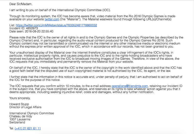 Pocos días después de la publicación de este GIF, la cuenta del periodista resultó suspendida. La red social le envió un correo que incluía un mensaje del COI, advirtiendo que si no respondía en un plazo de 10 minutos, el organismo podía iniciar "cualquiera acción" en su contra sin previo aviso.